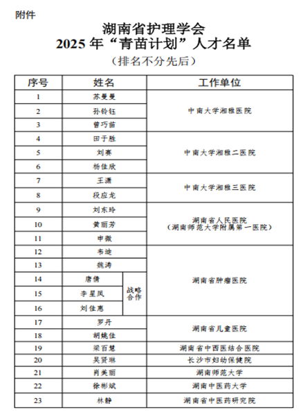 据悉,湖南省护理学会“青苗计划”人才项目旨在选拔省内医疗卫生机构、高等院校、科研院所从事护理学相关的青年护理人才,在人才建设、经费投入、科研项目申报等方面支持其围绕护理学科前沿、临床实践难点及健康服务需求开展创新性研究,提升科研能力和学术水平,为湖南省护理事业的可持续发展储备核心力量。