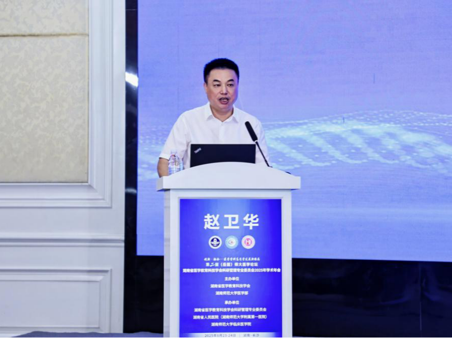 赵卫华书记代表承办单位致欢迎辞,本次论坛聚焦“创新”与“融合”两大关键词,既是对国家“健康中国”战略的积极响应,也是对湖南省“三高四新”战略中科技创新要求的深入践行,期待为与会代表提供一场思想盛宴,为医学学科发展注入新动能。