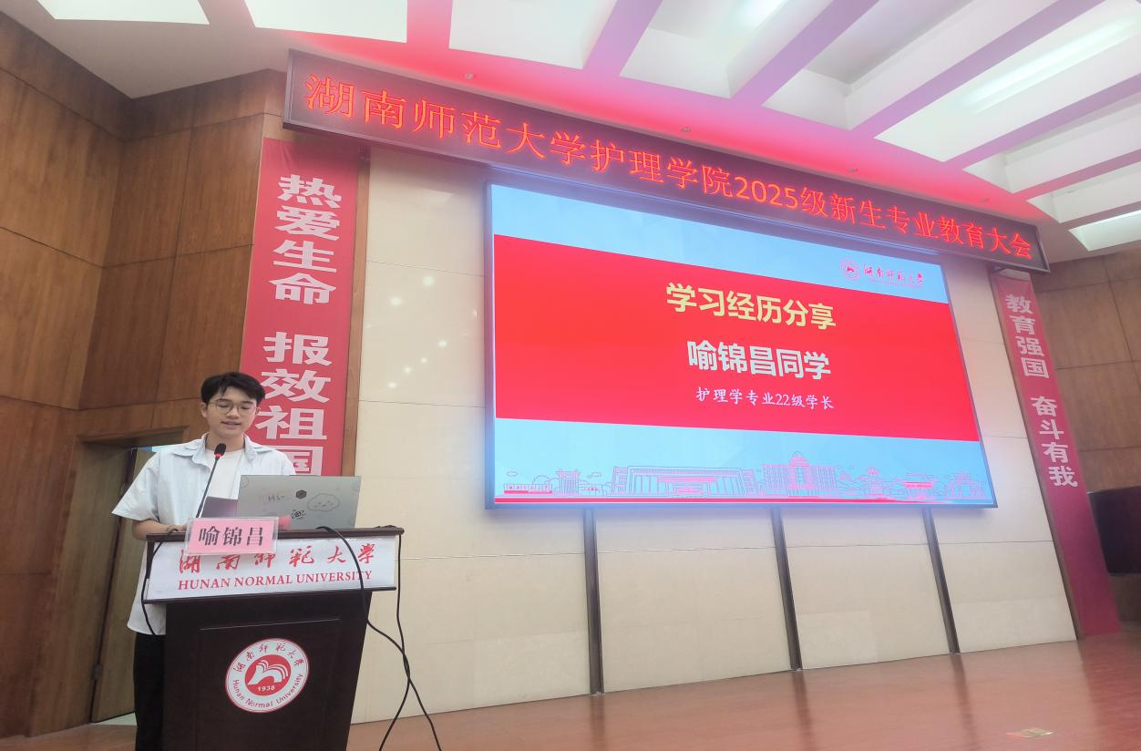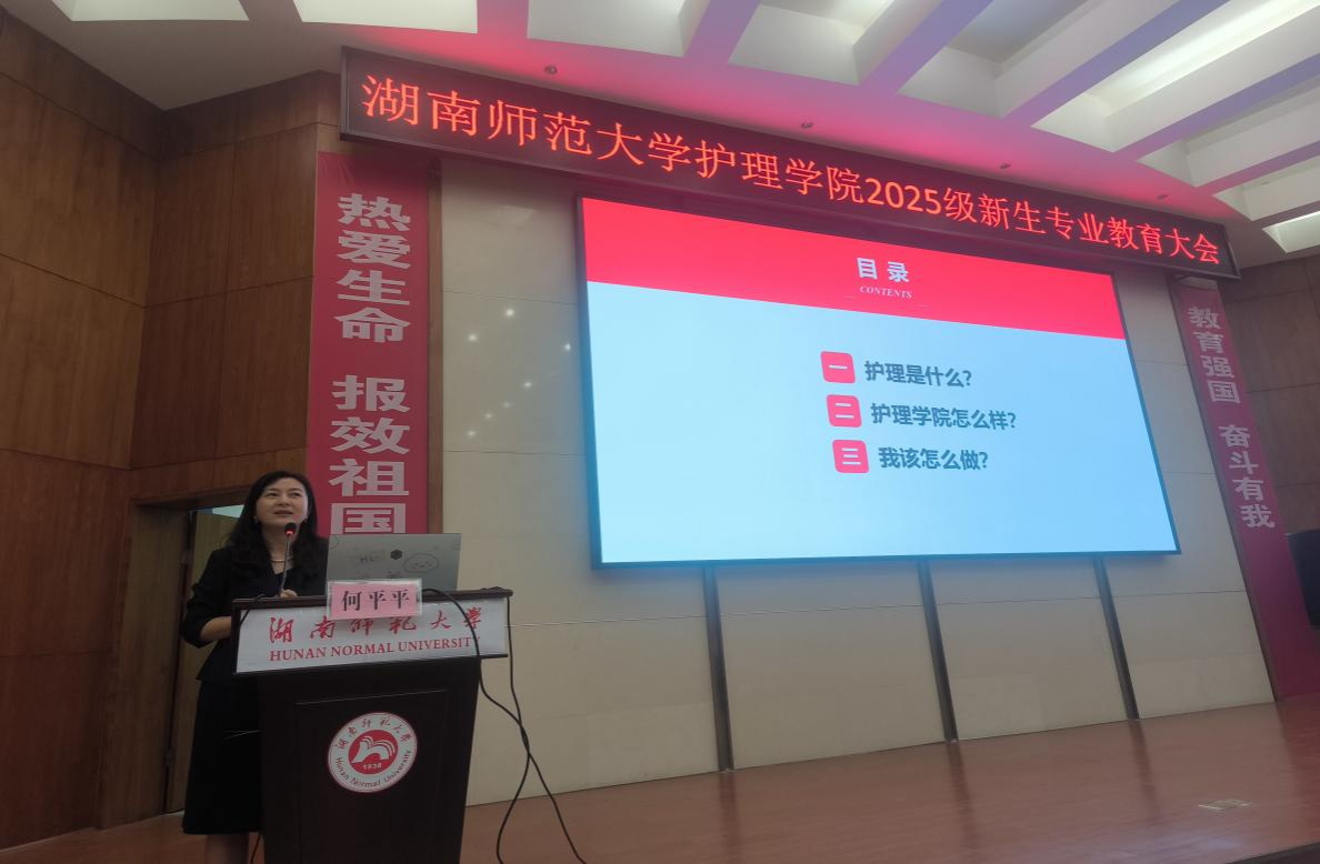 金秋送爽,丹桂飘香。湖南师范大学护理学院2025级新生专业教育大会于咸嘉湖校区学术报告厅隆重召开。与会人员包括2025级全体新生、学院教师代表,以及特邀嘉宾——岳阳职业技术学院护理学院副院长黄耀元、专职辅导员邓贻仁、任晓璐,和优秀校友徐芙蓉。