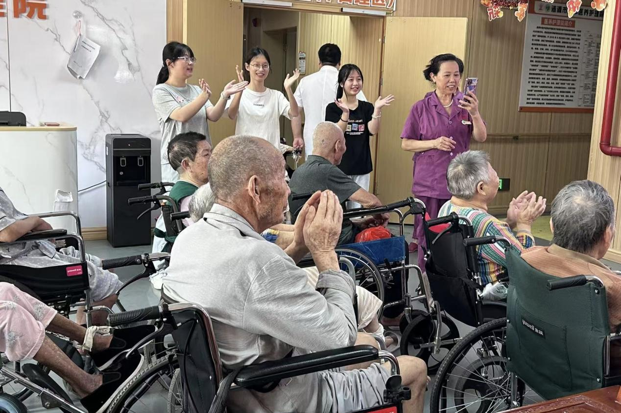 实践一开始,成员们便投入到细致的基础工作中。在生活区,成员们进行了病房清洁,对易积尘区域进行彻底擦拭,有效降低环境感染风险;运用专业消毒工具,耐心为老人修剪指甲并清理甲缝污垢,这不仅关乎个人卫生,更是预防皮肤感染和压疮发生的重要环节;理发时成员们细心观察老年人坐姿习惯,调整操作高度,将“舒适照护”的理念落实到细节。为避免老年人摔倒所造成的严重后果,实践团成员重点关注活动中心的环境安全保障及其优化。成员逐一检查全院走廊扶手的稳固性,确保其成为老人行走的有力支撑;在易滑地面增设醒目标识,提前预警潜在风险。这些看似微小的举措,实则是构筑老人安全生活空间不可或缺的保障。活动期间,实践团成员积极引导老人进行健康活动。通过组织手指关节操练习,增强了老人的手部灵活性,也促进了全身协调性,体现“小动作、大健康”的理念;辅助老人进行平衡行走训练,维持老人运动功能,跌倒预防;陪伴老人聆听戏曲经典选段。部分长者主动分享人生故事,双方在情感交流中实现了相互的心灵滋养。