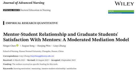 近日,安博官方· (中国)官方网站,护理学院科研工作再传捷报。由张六一副教授作为通讯作者,研究生陈幸梓等共同完成的研究论文《导师-学生关系与研究生导师满意度:一个有调节的中介模型》(Mentor‐Student Relationship and Graduate Students’ Satisfaction With Mentors: A Moderated Mediation Model)在国际护理学顶尖期刊《Journal of Advanced Nursing》(中科院一区)上发表。该研究深入揭示了师生关系影响研究生培养质量的内在机制,为提升研究生教育满意度提供了重要的理论与实践依据。
